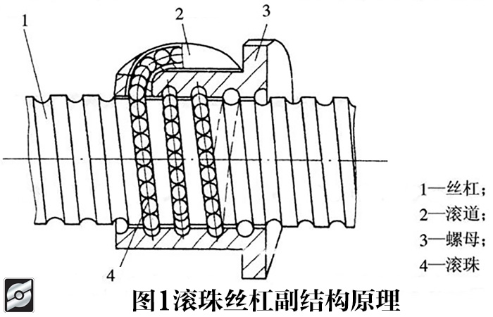 絲杠與滑塊之間安有滾珠做為中間元件的絲杠就叫做滾珠絲杠,其原理結構如圖1所示。在1和3上都裝有半圓形的螺旋凹槽,當它們組裝在一塊時,便構成了滾珠的螺旋滾動通道。滑塊上有著滾珠的回路管道(圖中4號部位),將螺旋滾動通道的兩頭銜接起來,使其封閉并循環,且在其內部填滿滾珠。在絲杠進行旋轉的時候,在滾動通道里滾珠同時具有自轉和沿滾道的循環這兩種運動,進而帶動螺母或絲杠的軸向移動。